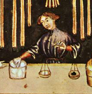 Pintura medieval mostrando um mercador pesando açúcar em uma balança. |